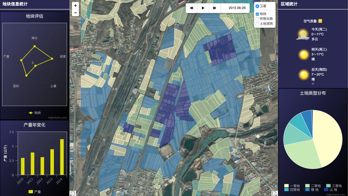 佳格大數(shù)據(jù)董事長張弓告訴36氪,一些大農(nóng)場擁有幾百畝地,但很少是連成一片的,故而其客戶往往首先利用佳格軟件進行資產(chǎn)管理,也就是遠程可視化查看自家土地,進而對土地分級。再舉幾個具體的應(yīng)用場景,佳格通過氣象信息預(yù)測天氣從而幫助農(nóng)民判斷是否要灌溉,避免水資源浪費;根據(jù)一塊地過去數(shù)十年的產(chǎn)量、災(zāi)害情況來判斷它適合種什么品類、土地資產(chǎn)價值(已經(jīng)有土流地磚服務(wù)商利用佳格做土地資產(chǎn)評估);監(jiān)測到蟲害后,通過軟件遠程遙控植保無人機去撒藥……