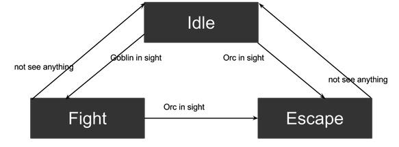 首先要說一下有限狀態(tài)機(FSM),一般應(yīng)用于游戲機器人,網(wǎng)絡(luò)協(xié)議,正則表達式,詞法語法分析,自動客服等。如下圖是一個簡單的游戲機器人狀態(tài)轉(zhuǎn)移和行動圖。